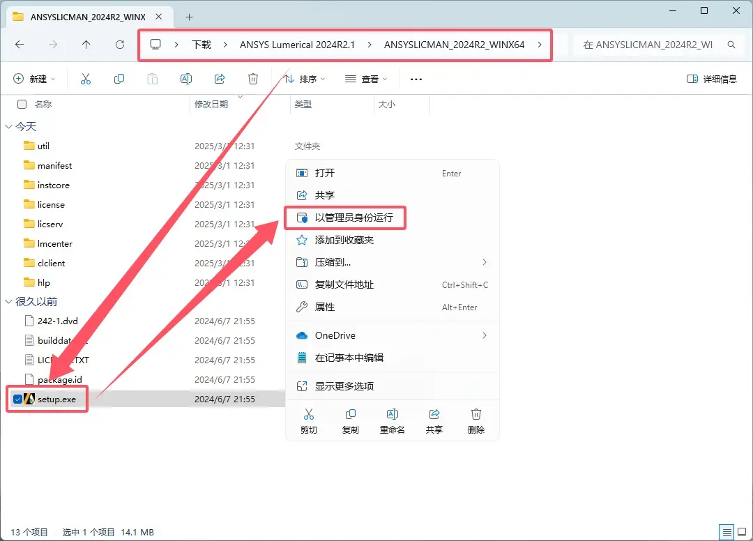 \ANSYS Lumerical 2024R2.1\ANSYSLICMAN_2024R2_WINX64文件夹,右键setup.exe,以管理员身份运行。