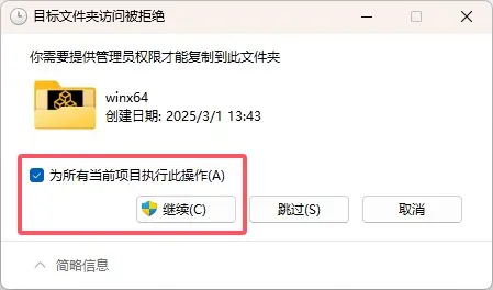 目标文件夹访问被拒绝,选择为所有当前项目执行此操作,点击继续。