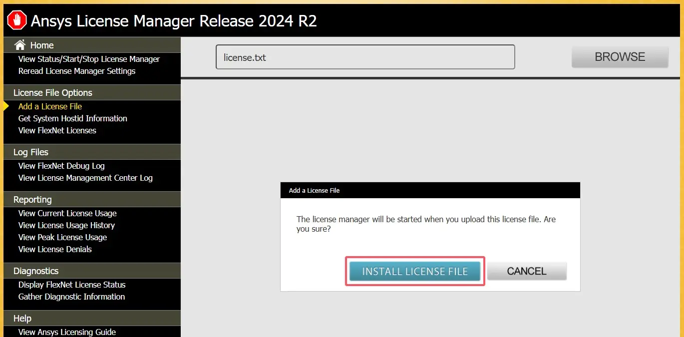 ANSYS License Management Center页面,点击Add a License File,点击BROWSE。