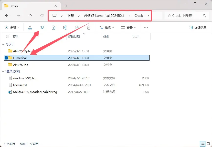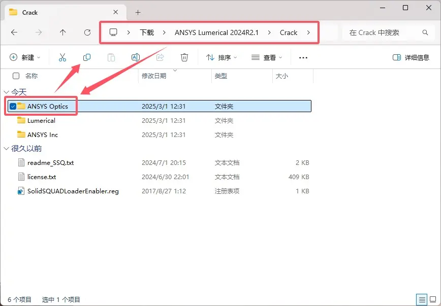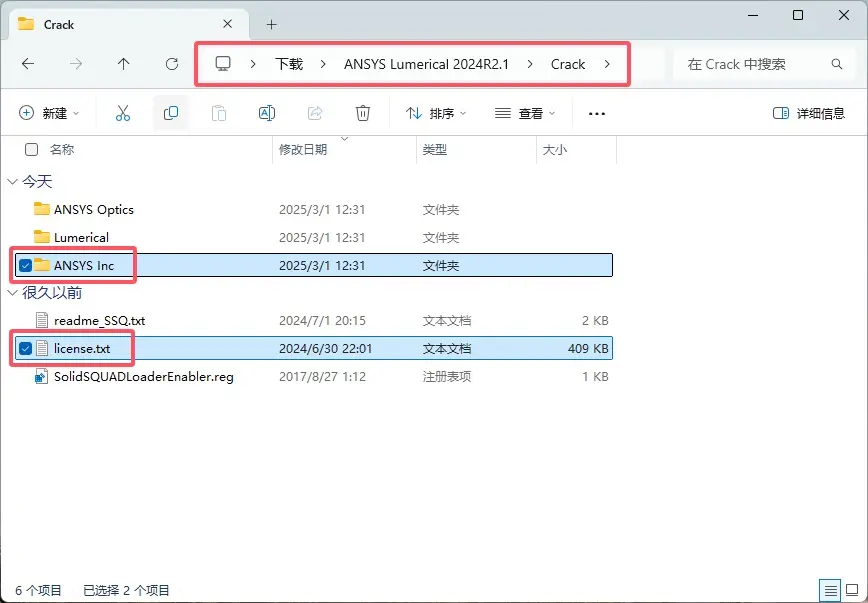 \ANSYS Lumerical 2024R2.1\Crack文件夹,选中ANSYS Inc文件夹和license.txt文件,右键复制。
