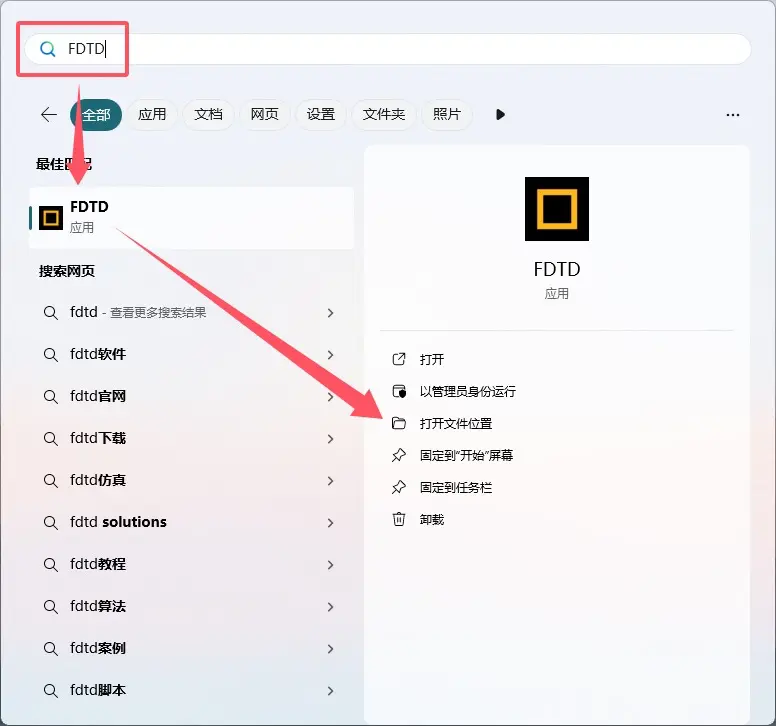 开始菜单,搜索FDTD应用,打开文件位置。
