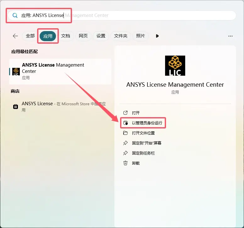 开始菜单,搜索ANSYS License Management Center应用,以管理员身份运行。