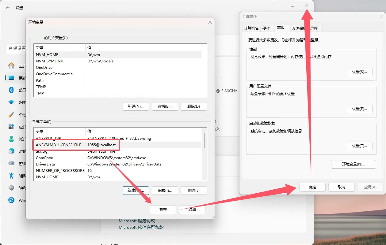 确定,系统属性点击确定,关闭设置。