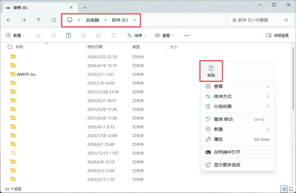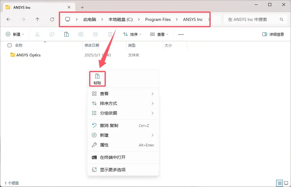 \ANSYS Inc的上一级路径,右键粘贴。